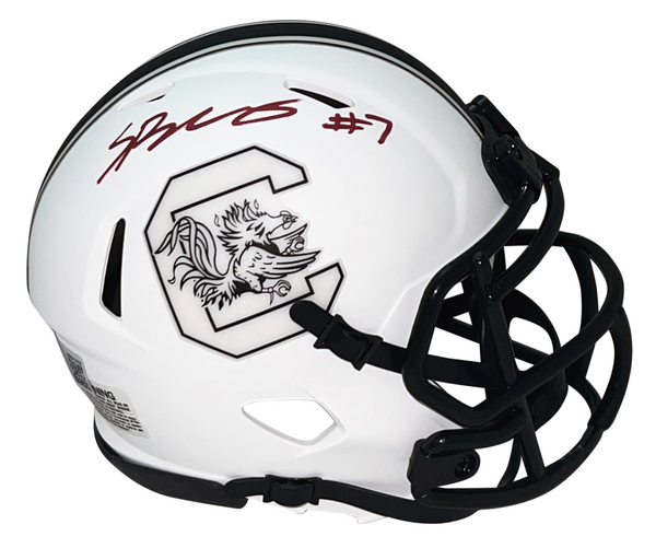 Spencer Rattler, star quarterback for the Gamecocks, has hand signed this South Carolina Riddell Speed Lunar mini helmet at a private signing. This item is authenticated by Beckett Authentication Services and was signed in the presence of one of their representatives. Their tamper-evident hologram featuring a QR code and serial number is on the item. The authenticity can be verified online by entering the serial number or scanning the QR code.Item pictured may not be the exact item you will receive. It will be similar quality, and we guarantee your satisfaction.