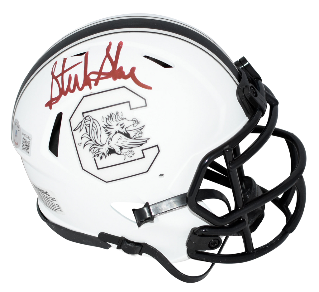 Sterling Sharpe, former All-American wide receiver for the Gamecocks, has hand signed this South Carolina Riddell Speed Lunar mini helmet at a private signing. This item is authenticated by Beckett Authentication Services and was signed in the presence of one of their representatives. Their tamper-evident hologram featuring a QR code and serial number is on the item. The authenticity can be verified online by entering the serial number or scanning the QR code.Item pictured may not be the exact item you will receive. It will be similar quality, and we guarantee your satisfaction.