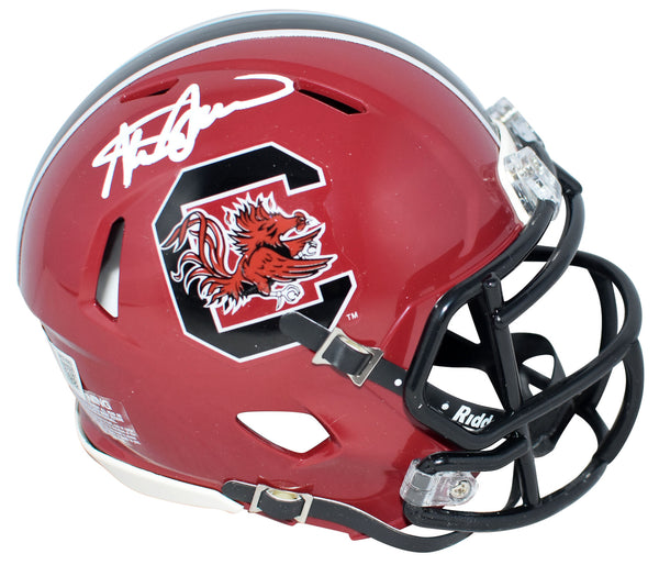 Steve Spurrier, former head coach of the Gamecocks, has hand signed this South Carolina Riddell Speed mini helmet at a private signing. This item is authenticated by Beckett Authentication Services and was signed in the presence of one of their representatives. Their tamper-evident hologram featuring a QR code and serial number is on the item. The authenticity can be verified online by entering the serial number or scanning the QR code.Item pictured may not be the exact item you will receive. It will be similar quality, and we guarantee your satisfaction.