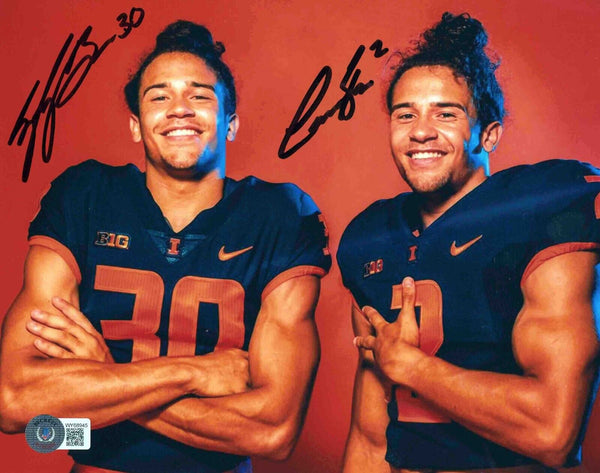 Sydney Brown and Chase Brown, former stars for the Illinois Illini, have each hand signed this 8x10 photo at a private signing. This item is authenticated by Beckett Authentication Services and was signed in the presence of one of their representatives. Their tamper-evident hologram featuring a QR code and serial number is on the item. The authenticity can be verified online by entering the serial number or scanning the QR code.Item pictured may not be the exact item you will receive. It will be similar quality, and we guarantee your satisfaction.