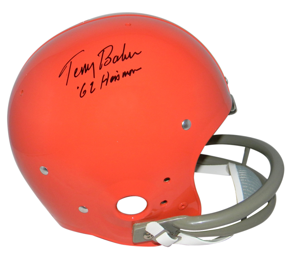 Terry Baker, former Heisman Trophy winning quarterback for the Beavers, has hand signed this Oregon State Riddell full-size throwback helmet at a private signing. He included the inscription "62 Heisman" with his signature. This helmet is a reproduction of the style Baker wore in the 1960's with the suspension inside. This item comes with a certificate of authenticity (COA) from JSA - James Spence Authentication and was signed in the presence of one of their representatives. You will receive a serial-numbered COA along with a matching serial-numbered sticker on the helmet. The authenticity can be verified online by entering the serial number.Item pictured may not be the exact item you will receive. It will be similar quality, and we guarantee your satisfaction.