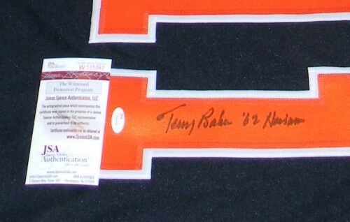 Terry Baker, former Heisman Trophy winning quarterback for the Oregon State Beavers, has hand signed this black custom jersey at a private signing. Jersey is size XL and all letters/numbers are sewn-on. This item comes with a certificate of authenticity (COA) from JSA - James Spence Authentication and was signed in the presence of one of their representatives. You will receive a serial-numbered COA along with a matching serial-numbered sticker on the jersey. The authenticity can be verified online by entering the serial number.Item pictured may not be the exact item you will receive. It will be similar quality, and we guarantee your satisfaction.