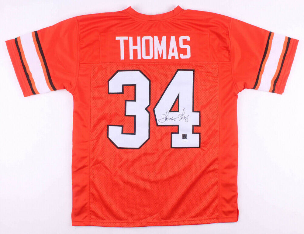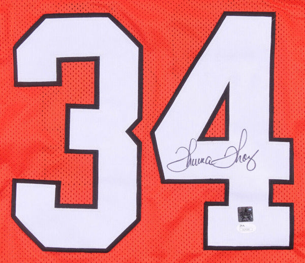 Custom on-field style jersey. Everything is sewn on, size XL. Hand-signed in black felt-tip pen by Thurman Thomas (HOF). The lot / autograph(s) includes an official James Spence Authentication (JSA) hologram and matching COA for authenticity purposes.Authentication: JSA COA