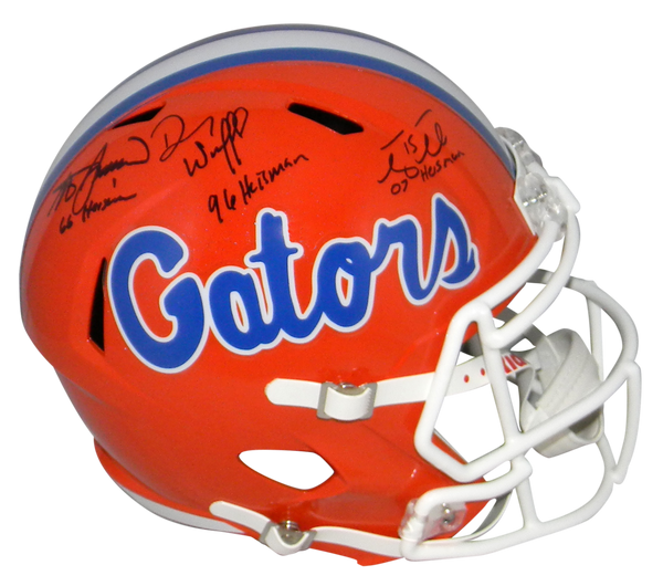Tim Tebow, Steve Spurrier and Danny Wuerffel, the 3 Heisman Trophy winners for the Gators, have each hand signed this Florida Riddell Speed full-size replica helmet at a private signing. Each player included his Heisman inscription. This item comes with a certificate of authenticity (COA) from Beckett Authentication Services and was signed in the presence of one of their representatives. You will receive a serial-numbered COA along with a matching serial-numbered sticker on the helmet. The authenticity can be verified online by entering the serial number.Item pictured may not be the exact item you will receive. It will be similar quality, and we guarantee your satisfaction.