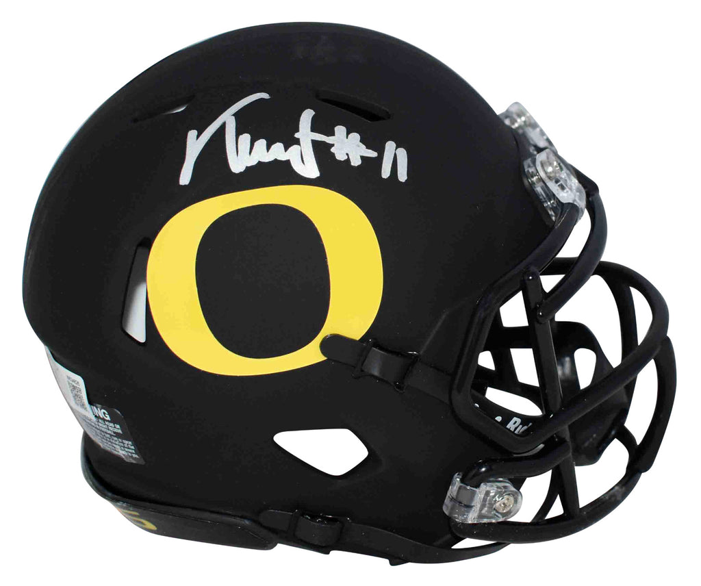 Troy Franklin, star wide receiver for the Ducks, has hand signed this Oregon Riddell Speed mini helmet at a private signing. This item is authenticated by Beckett Authentication Services and was signed in the presence of one of their representatives. Their tamper-evident hologram featuring a QR code and serial number is on the item. The authenticity can be verified online by entering the serial number or scanning the QR code.Item pictured may not be the exact item you will receive. It will be similar quality, and we guarantee your satisfaction.