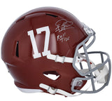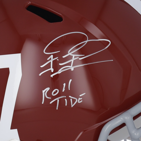 This authentic speed helmet has been personally hand-signed by Tua Tagovailoa with the added inscription "Roll Tide." It is officially licensed by the NCAA and comes with an individually numbered, tamper-evident hologram from Fanatics Authentic. To ensure authenticity, the hologram can be reviewed online. This process helps to ensure that the product purchased is authentic and eliminates any possibility of duplication or fraud.