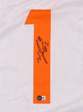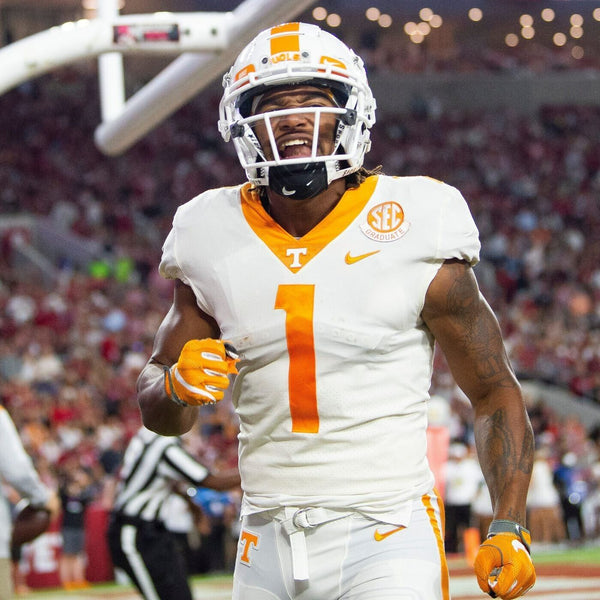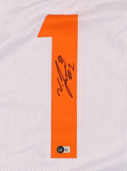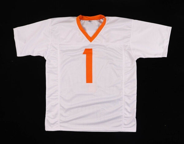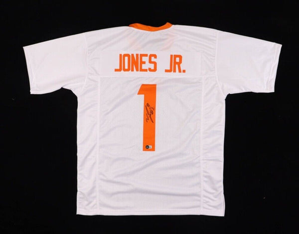 This autographed jersey has been personally hand-signed by Velus Jones Jr. of the Tennessee Volunteers. This autograph is certified by Beckett Authentication Services (BAS) Witness Certification. That means that a Beckett representative was present when this item was signed. It comes with the numbered authentication hologram with a QR code that verifies the authentication on the Beckett website.Custom on-field style jerseys are a more affordable option for autograph seekers. These jerseys do not have any brand name or tags and are made in the Philippines. They feature stitched on names and numbers and are made to look very similar to the on-field jerseys that the players wear. These custom jerseys are very commonly used in the memorabilia industry.
