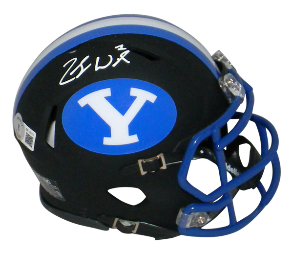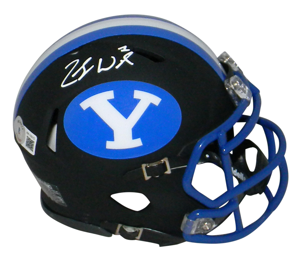 Zach Wilson, former star quarterback for the Cougars, has hand signed this matte black BYU Riddell Speed mini helmet at a private signing. This item comes with a certificate of authenticity (COA) from Beckett Authentication Services and was signed in the presence of one of their representatives. You will receive a serial-numbered COA along with a matching serial-numbered sticker on the helmet. The authenticity can be verified online by entering the serial number.Item pictured may not be the exact item you will receive. It will be similar quality, and we guarantee your satisfaction.