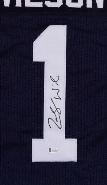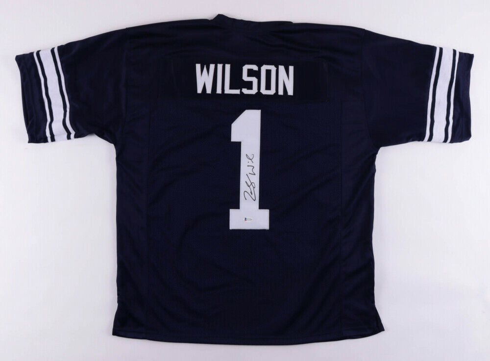 Custom on-field style jersey. Everything is sewn on, size XL. Has been hand-signed by Zach Wilson.The lot / autograph(s) includes an official Beckett Authentication Services serially-numbered hologram and matching COA for authenticity purposes. The signing of this item was witnessed by Beckett.Authentication: Beckett COA Shop our ebay store / Friendly Confines Collectibles for thousands of different autographed jerseys