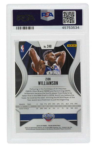 Featured is a Zion Williamson Duke slabbed 2019 Panini Prizm #248 basketball card. This card has been slabbed and authenticated by PSA authentication services which have graded the card at a Gem Mint 10... SPECIFICATIONS Autographed By: Team: Duke Blue Devils Sport: Basketball Authentication: Professional Sports Authenticator (PSA)