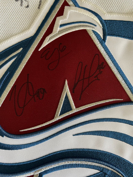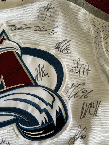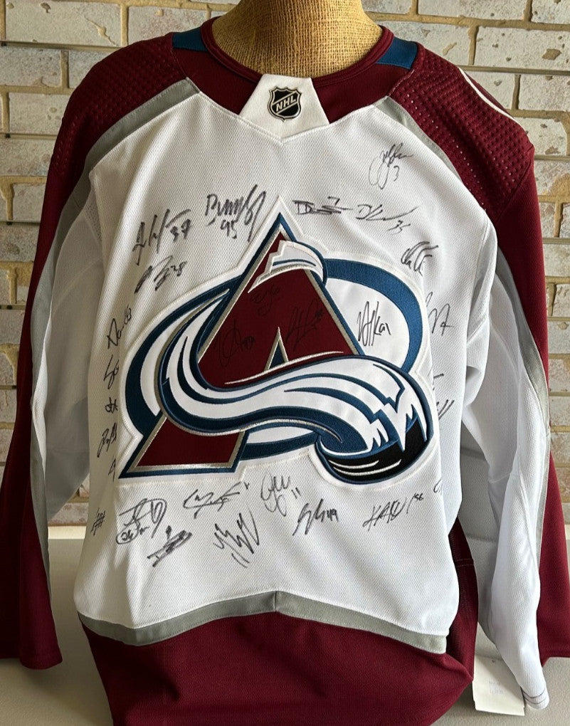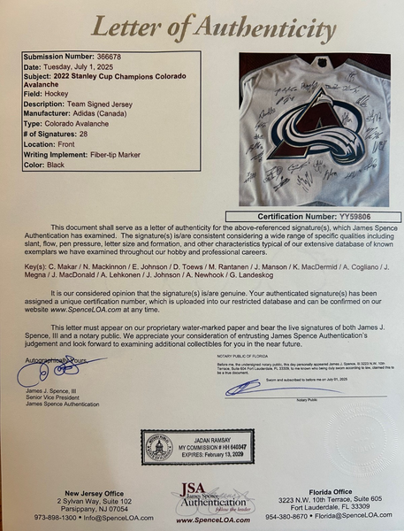 2022 Stanley Cup Champions Colorado Avalanche Team Signed Jersey - JSA Certified Own the ultimate piece of Stanley Cup championship history with this extraordinary 2022 Colorado Avalanche team-signed jersey featuring 28 authentic signatures from the Stanley Cup Champions. This museum-quality collectible captures one of the most dominant championship runs in recent NHL history. Historic 2022 Stanley Cup Championship: Stanley Cup Champions - Colorado's third championship in franchise history Dominant Playoff Run - Defeated Tampa Bay Lightning 4-2 in Finals President's Trophy Winners - Best regular season record (56-19-7) Conn Smythe Trophy Winner - Cale Makar's historic performance Franchise Revival - First Cup since 2001 Championship Team Signatures (28 Total Including): Gabriel Landeskog - Team captain and championship leader Cale Makar - 2022 Conn Smythe Trophy winner Nathan MacKinnon - Hart Trophy winner and franchise superstar Erik Johnson - Veteran defenseman and alternate captain Devon Toews - All-Star defenseman Mikko Rantanen - Elite scoring winger Josh Manson - Defensive stalwart Kurtis MacDermid - Enforcer and team energy Andrew Cogliano - Veteran forward and penalty killer Jayson Megna - Depth forward Jacob MacDonald - Defenseman Artturi Lehkonen - Clutch playoff performer and goal scorer Jack Johnson - Veteran defenseman Alex Newhook - Young forward prospect Plus 14 additional championship team members Authentication & Investment Value: This jersey comes with a James Spence Authentication (JSA) Letter of Authenticity, ensuring all 28 signatures are genuine. As a complete championship team-signed jersey, this represents the pinnacle of Colorado Avalanche collectibles and exceptional investment value. Perfect For: Colorado Avalanche collectors and Stanley Cup enthusiasts Investment-grade championship memorabilia Ultimate centerpiece for serious hockey collections Once-in-a-lifetime collectible - Complete championship team signatures This team-signed jersey represents more than memorabilia - it's a tangible piece of Stanley Cup history, signed by every member of one of the most talented and dominant championship teams in modern NHL history, making it the crown jewel of any serious hockey collection.