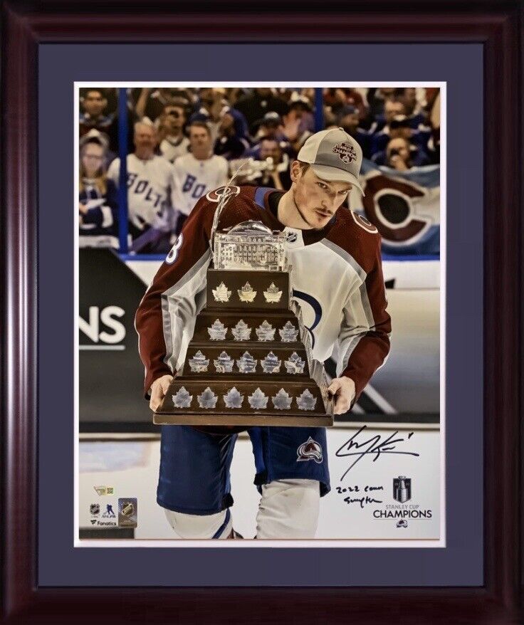 Colorado Avalanche Cale Makar hand signed framed 16x20 photograph. The photo shows him holding the Conn Smythe Trophy after winning it. Hand signed auto with 2022 Conn Smythe inscribed. Beautiful Mint Autograph! This is custom framed beautifully in cherry wood with a blue outer and a white inner and is ready to hang. The final framed dimensions are approximately 23x30. This is Fanatics certified with their hologram that you can verify on their website.as we show