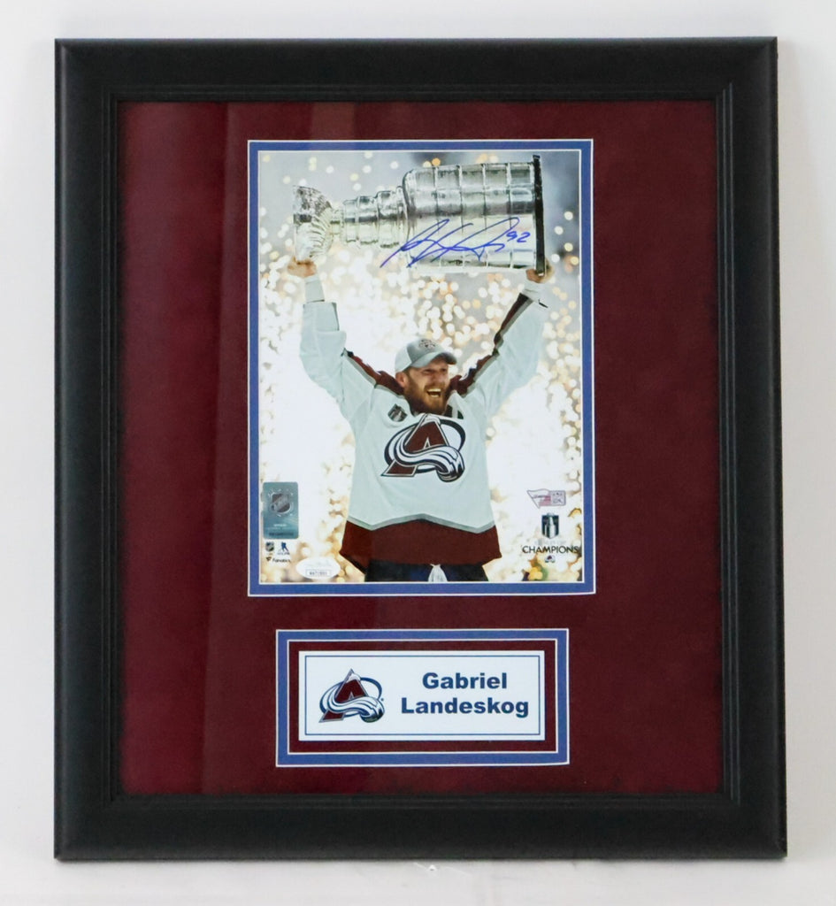 The product is an 8x10 autographed photo of Gabriel Landeskog holding the Stanley Cup with a deluxe frame, authenticated by James Spence Authentication (JSA). This collectible item features a genuine autograph from the Colorado Avalanche hockey player, making it a valuable addition for fans of the team or collectors of sports memorabilia. The high-quality frame adds to the overall aesthetic appeal of the piece, making it a unique and cherished item for any hockey enthusiast.