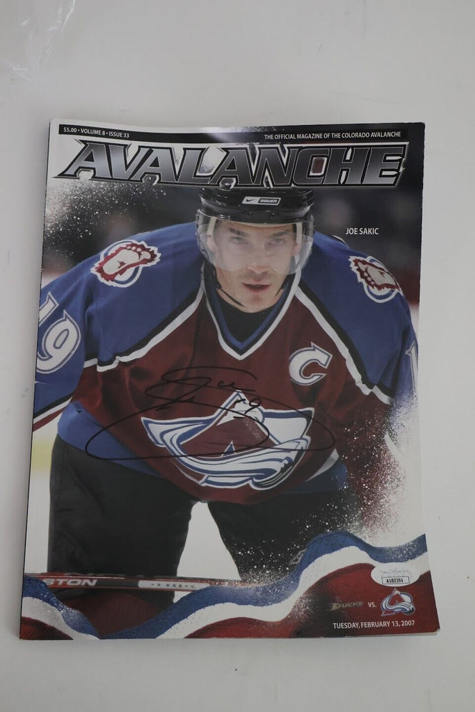 This magazine is a rare find for any hockey fan! It features an authentic autograph from Joe Sakic, a legendary player for the Colorado Avalanche. The signature has been authenticated by James Spence Authentication (JSA), ensuring its authenticity. This original piece is perfect for any collector or fan of the sport.
