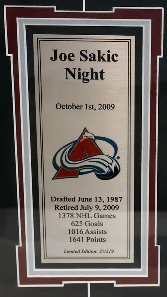 Own a piece of hockey history with this exclusive Joe Sakic Night commemorative display featuring an authentic autographed ticket, professional photo, and custom engraved plaque. This premium collectible celebrates the legendary career of Hall of Famer Joe Sakic, making it the perfect centerpiece for any serious hockey collection.What Makes This Special: Authentic Joe Sakic Signature: Hand-signed ticket from the official Joe Sakic Night ceremony, verified with JSA Certificate of Authenticity Premium Display Quality: Professionally mounted with museum-quality materials for lasting preservation Complete Presentation: Includes high-resolution photo and custom engraved commemorative plaque Investment Grade: JSA authentication ensures maximum collectible value and resale potential Ready to Display: Arrives fully assembled and ready to hang in your home, office, or man cave Perfect For: Colorado Avalanche fans, hockey memorabilia collectors, sports investors, or anyone who appreciates authentic NHL history. This unique piece captures the essence of one of hockey's greatest players and most memorable nights. Joe Sakic's legacy as a two-time Stanley Cup champion, Olympic gold medalist, and Hockey Hall of Famer makes this authenticated memorabilia a treasured addition to any collection. Don't miss this opportunity to own a piece of hockey greatness.