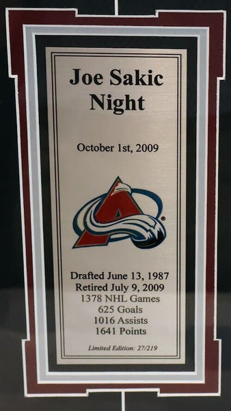 Celebrate the legacy of hockey legend Joe Sakic with this unique collectible: a signed ticket from Joe Sakic Night, beautifully displayed with a photo and an engraved plaque. Authenticated by JSA, this piece is a must-have for any hockey enthusiast or collector. Key Features: Authentic Signature: Hand-signed by Joe Sakic, ensuring the highest level of authenticity and collectability. Exclusive Memorabilia: Features a ticket from Joe Sakic Night, a special event commemorating his illustrious career. Premium Display: Includes a high-quality photo and an engraved plaque, professionally mounted to enhance presentation. JSA COA: Comes with a Certificate of Authenticity from JSA, providing confidence in the legitimacy of the autograph.