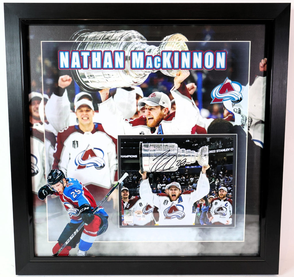 The Nathan MacKinnon Autographed CO Avalanche Lighted Shadowbox 8x10 is a unique and collectible photo featuring the talented hockey player signed by himself. This original autographed piece comes with a Fanatics Authentic COA, ensuring the authenticity of the signature. The photo showcases MacKinnon wearing the Colorado Avalanche team's jersey, making it a prized item for fans of the sport and the player. The lighted shadowbox adds a special touch to this valuable sports memorabilia.Framed Size: 23"x23"