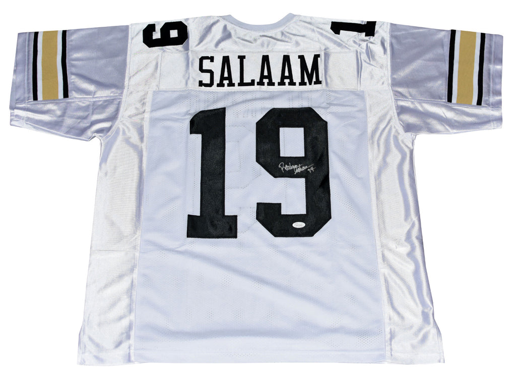 Rashaan Salaam, former Heisman Trophy winning running back for the Colorado Buffaloes, has hand signed this custom white jersey at a private signing. Jersey is size XL and all letters/numbers are sewn-on. This item comes with a certificate of authenticity (COA) from JSA - James Spence Authentication and was signed in the presence of one of their representatives. You will receive a serial-numbered COA along with a matching serial-numbered sticker on the jersey. The authenticity can be verified online by entering the serial number.Item pictured may not be the exact item you will receive. It will be similar quality, and we guarantee your satisfaction.