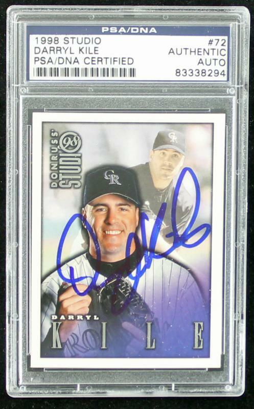 This ROCKIES DARRYL KILE AUTHENTIC SIGNED CARD 1998 STUDIO #72 PSA/DNA SLABBED has been certified authentic. It comes slabbed and authenticated by PSA/DNA. You can also see the authentication on the PSA/DNA website, PSAcard.com.