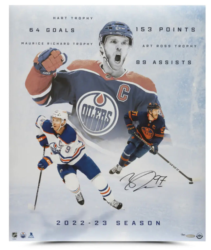 Connor McDavid's 2022-2023 season would have been remarkable by any hockey players' standards but even on his own incredibly high level the season was his best yet. His 153 points, the most since Mario Lemieux scored 161 in 1995-96, were 30 more than his next best season, when he put up 123 in the 2022-23 season. The same can be said for his goals (Career high 64 in 2022-23 vs his previous high of 44 in 2021-22) and assists (Career high 89 in 2022-23 vs his previous high of 79 in 2021-22). McDavid?S 153 points ranked as the 15th best all time and there have only been 3 other players who have had higher scoring seasons than McDavid (Wayne Gretzky, Mario Lemieux, and Steve Yzerman). While McDavid's 2022-23 season may not compare to the multiple 200+ point seasons of Wayne Gretzky it still will rank as one of the best seasons by an Oilers player of all-time. This image is autographed by Connor McDavid. McDavid's signature was witnessed by an Upper Deck representative as part of UDA's 5-step authentication process. This item is limited to 97.