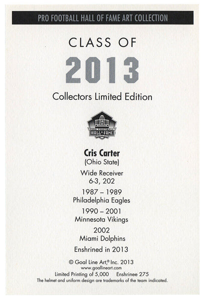 Cris Carter signed Minnesota Vikings hall of fame Goal Line Art card. Item comes with a Schwartz Sports Memorabilia tamper-proof numbered hologram (on back of physical card) and Certificate of Authenticity which can be verified online.
