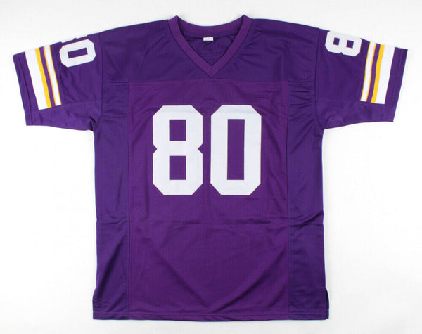 Custom on-field style jersey. Everything is sewn on, size XL. Hand-signed in black paint pen by Cris Carter (HOF). The lot / autograph(s) includes an official Beckett Authentication Services serially-numbered hologram and matching COA for authenticity purposes. The signing of this item was witnessed by Beckett.Authentication: Beckett COA