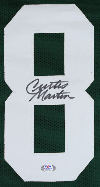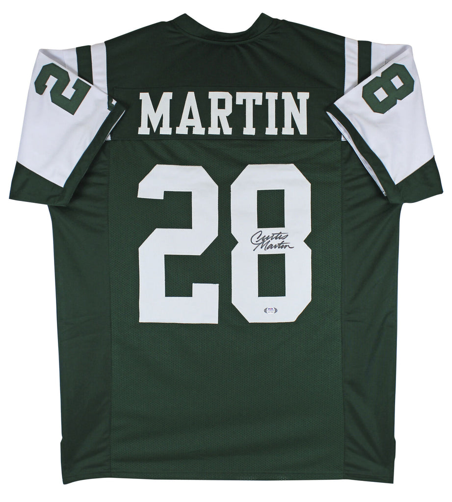 This Autographed Green Pro Style Jersey has been Personally Signed by Curtis Martin of the New York Jets. This item is 100% Authentic and comes with a PSA/DNA Certification Card and a matching numbered Hologram. This is a PSA in the Presence Authenticated item which means a PSA representative was present when this item was being signed. This is a stock item. We conducted an autograph signing with Curtis Martin and we have several of these available. The one you will receive will be of equal quality to the one pictured. This item can be verified through PSA/DNA Itp. This is a X-Large sized Jersey.