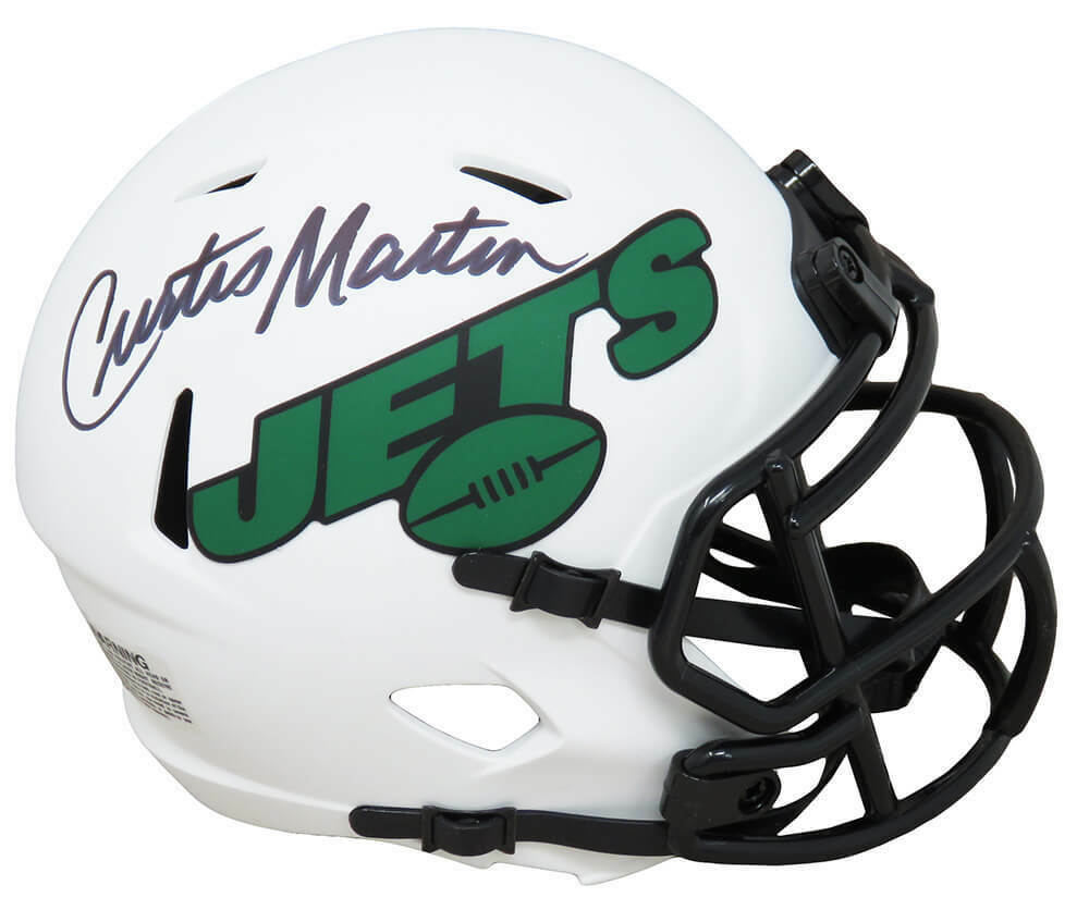 Curtis Martin signed New York Jets Lunar Eclipse white matte Riddell speed mini helmet. Item comes with a Schwartz Sports Memorabilia tamper-proof numbered hologram and Certificate of Authenticity which can be verified online.