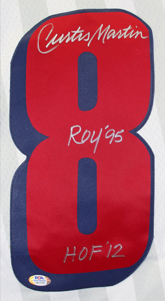 This Autographed White Mitchell & Ness Jersey with the inscription of "ROY 95, HOF 12" has been Personally Signed by Curtis Martin of the New England Patriots. This item is 100% Authentic and comes with a PSA/DNA Certification Card and a matching numbered Hologram. This is a PSA in the Presence Authenticated item which means a PSA representative was present when this item was being signed. The authenticity can be verified on Professional Sports Authenticator website. This is a X-Large sized Jersey.