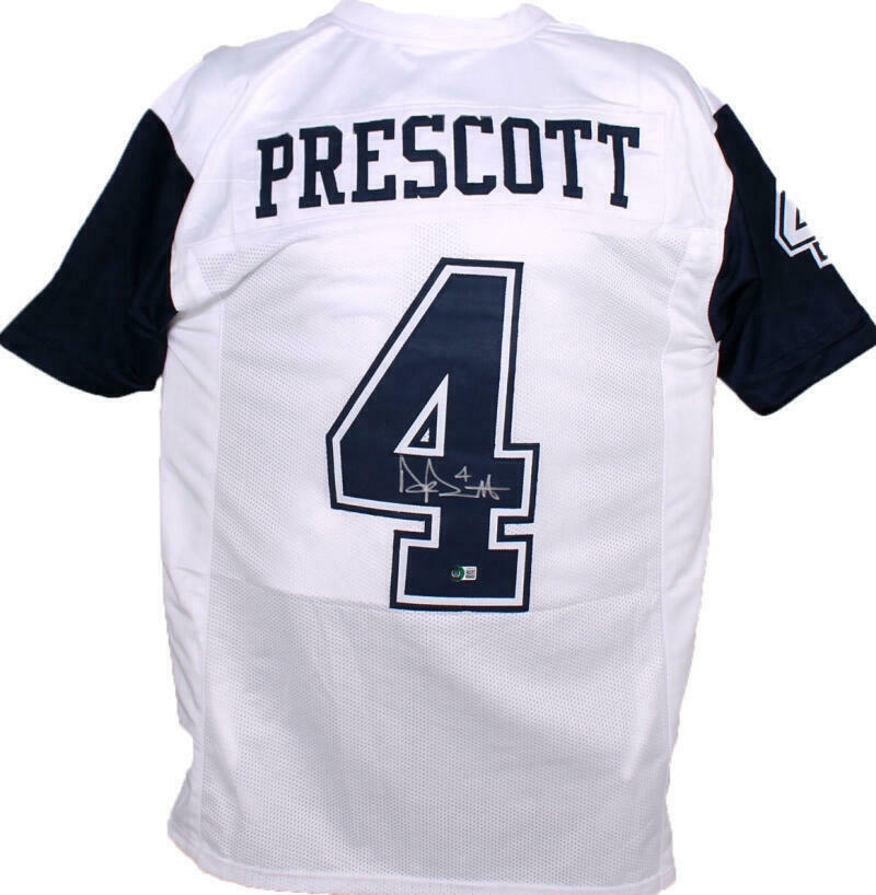 Dak Prescott Autographed White Alternate Pro Style Jersey-Beckett W Hologram *Silver THIS IS NOT AN NFL JERSEY. THIS HAS NO TAGS, NO LOGOS, NO EMBLEMS. This is a Rayne Dakota "Dak" Prescott hand autographed custom made (non name brand) authentic style (stitched letters and numbers) jersey. This item has a Beckett Witnessed Authentication, which comes with a Beckett numbered hologram and a generic Beckett Certificate of Authenticity. You can view this item on the Beckett Authentication website to see when and where it was signed. It was signed either at a public autograph appearance or a private signing. This is a stock photo of the item. Although you may not receive this exact item, the item you receive is virtually identical, brand new, and in great shape.