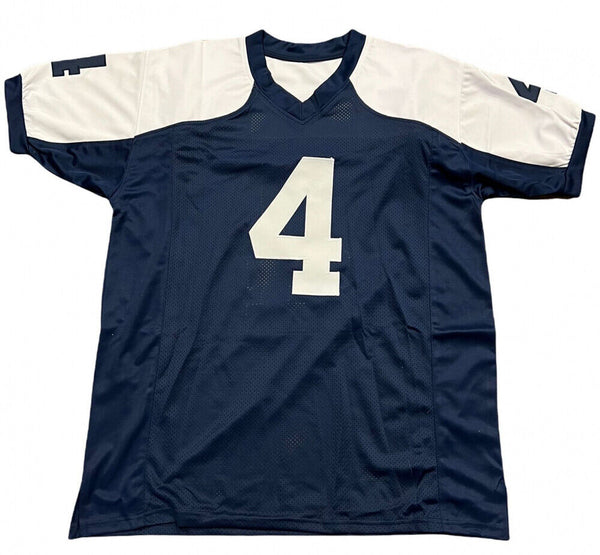 Custom on-field style jersey. Everything is sewn on, size XL. Hand-signed by Dak Prescott.The lot / autograph(s) includes an official James Spence Authentication (JSA) hologram as well as an official Dak Prescott player hologram for authenticity purposes. The signing of this item was witnessed by JSA.Authentication: JSA Hologram & Prescott Hologram