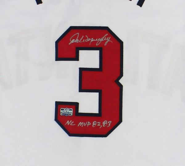 An Atlanta Custom White Jersey hand signed by Dale Murphy. The item and signature are in excellent condition. In addition to signing his name, Dale also inscribed "82 ,83 NL MVP" on the item. Dale 7x All-Star (1980,1982-1987). Dale 2x NL MVP (1982, 1983). Dale 5x Gold Glove Award (1982,1986). Dale 4x Sliver Slugger Award (1982,1985). Dale is a Roberto Clemente Award (1988). Dale 2x NL home run Leader (1984,1985). AUTHENTICATION: The item has been tagged with a SmarTag powered by Prova Technology, which gives you digital access to the items authentication records, including a proof picture from the signing.