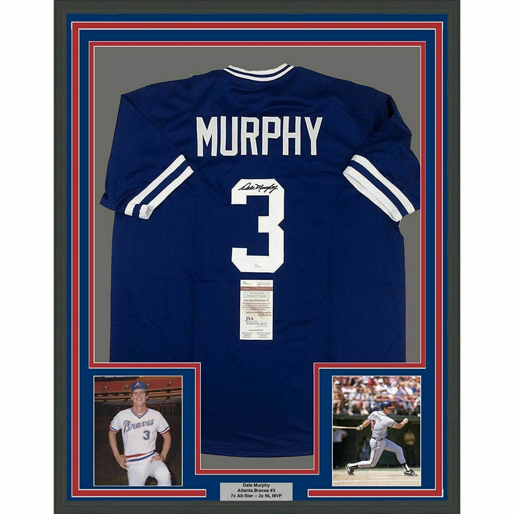 FRAMED Autographed/Signed DALE MURPHY 33x42 Atlanta Royal Blue Jersey JSA COA The item is professionally framed & matted with two 8x10 photos, measures 33"x42" and is ready to be hung in your man cave! NOTE: COA card will be mounted on the back of the frame, not inside it on top of the jersey as seen in the picture.