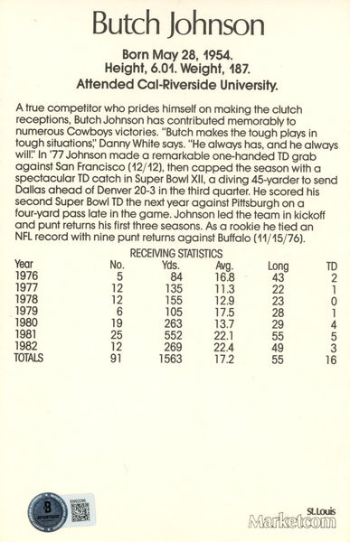 The number in the listing title is just an inventory sku for our records and is not the authentication number. This is the exact item that you will receive so please see pictures for condition. This is a mini poster measuring 8.5" x 5.5" that was personally autographed by Butch Johnson. Includes a certificate of authenticity from Beckett Authentication Services (BAS) and Denver Autographs.
