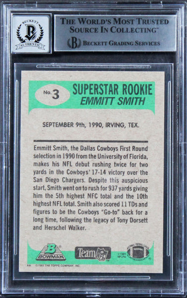 This Autographed Auto Graded Gem Mint 10! 1991 Bowman #3 Card has been Personally Signed by Emmitt Smith of the Dallas Cowboys. This item is 100% Authentic, it comes slabbed and authenticated by Beckett Authentication Services. The authenticity can be verified on Beckett Authentication Services website.