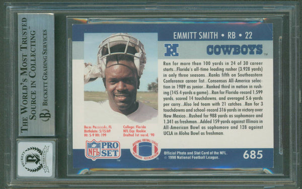 This Autographed Auto Graded Gem Mint 10! 1990 Pro Set #685 Rookie Card has been Personally Signed by Emmitt Smith of the Dallas Cowboys. This item is 100% Authentic, it comes slabbed and authenticated by Beckett Authentication Services. We conducted an autograph signing with Emmitt Smith where multiples of the same item were signed. While the photographs are representative of this item, the size, placement and strength of the signature may vary. Each item is hand signed, therefore, each autograph is unique. This item can be verified through BAS Slabbed.