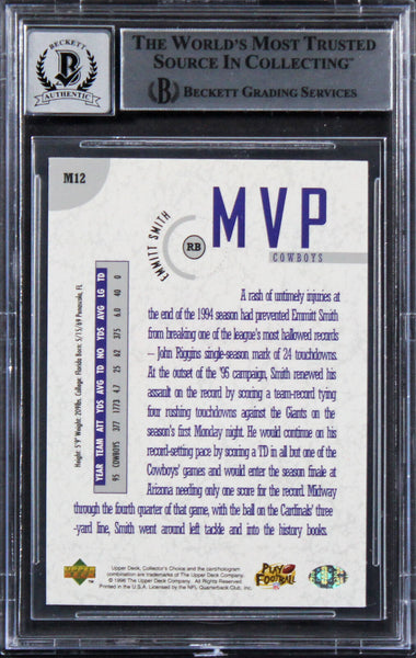 This Autographed Auto Graded Gem Mint 10! 1996 Collector's Choice MVPS #M12 Card has been Personally Signed by Emmitt Smith of the Dallas Cowboys. This item is 100% Authentic, it comes slabbed and authenticated by Beckett Authentication Services. The authenticity can be verified on Beckett Authentication Services website.