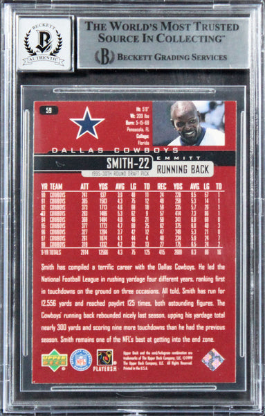This Autographed Auto Graded Gem Mint 10! 1999 Upper Deck #59 Card has been Personally Signed by Emmitt Smith of the Dallas Cowboys. This item is 100% Authentic, it comes slabbed and authenticated by Beckett Authentication Services. The authenticity can be verified on Beckett Authentication Services website.