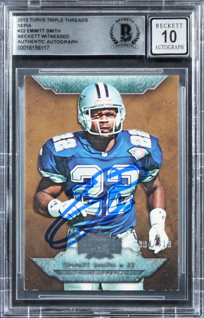 This Autographed Auto Graded Gem Mint 10! 2012 Topps Triple Threads Sepia #22 Card has been Personally Signed by Emmitt Smith of the Dallas Cowboys. This item is 100% Authentic, it comes slabbed and authenticated by Beckett Authentication Services. The authenticity can be verified on Beckett Authentication Services website.