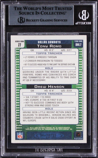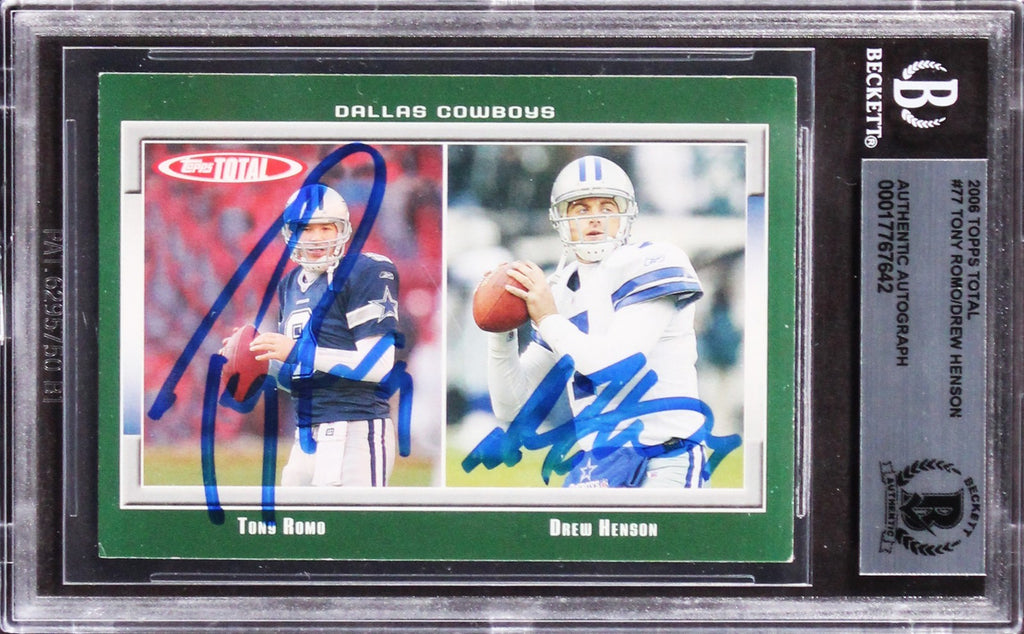 This Autographed 2006 Topps Total #77 Card has been Personally Signed by Tony Romo & Drew Henson of the Dallas Cowboys. This item is 100% Authentic, it comes slabbed and authenticated by Beckett Authentication Services. We have multiples of this same item. While the photographs are representative of this item, the size, placement and strength of the signature may vary. Each item is hand signed, therefore, each autograph is unique.