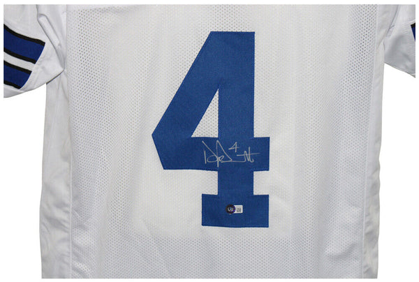Dak Prescott Autographed/Signed Pro Style White XL Jersey BAS 32773 The number in the listing title is just an inventory sku for our records and is not the authentication number. This is a custom pro style white XL jersey with sewn on name and numbers that was personally autographed by Dak Prescott. Includes a certificate of authenticity from Beckett Authentication Services (BAS) and Denver Autographs.