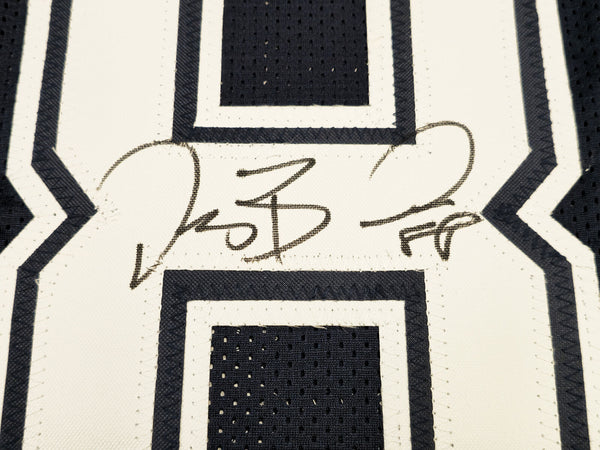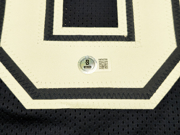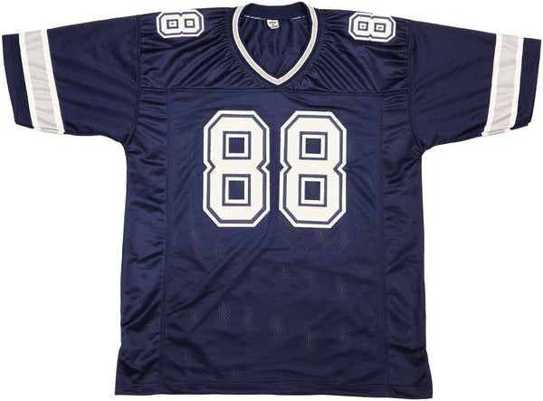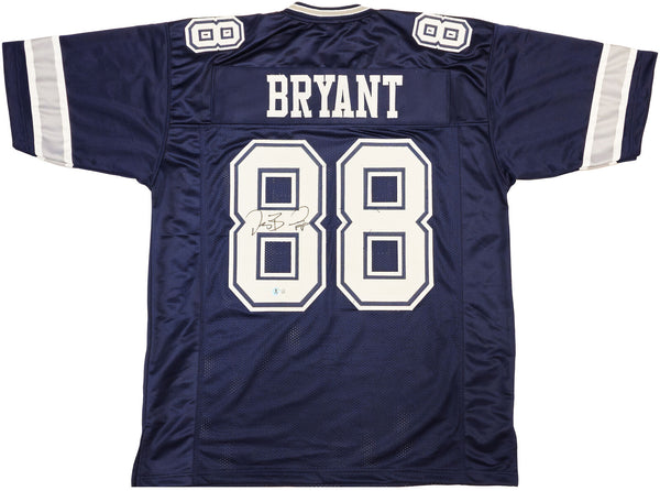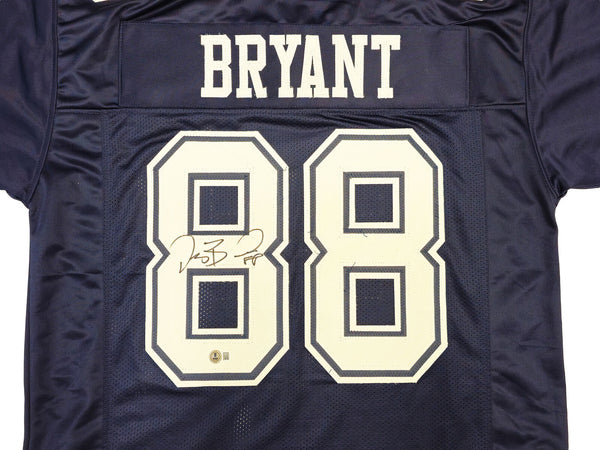 This is a Navy Jersey that has been hand signed by Dez Bryant. This is a custom jersey with no name brand. The approximate size is XL. It has nice sewn in name and numbers. This item has been witnessed and certified authentic by Beckett Authentication (BAS) and comes with their tamper-proof witness sticker.