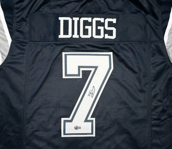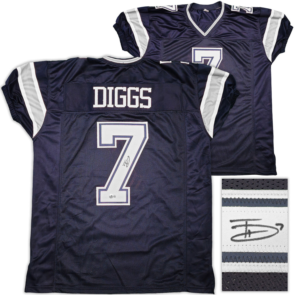 This is a Blue Jersey that has been hand signed by Trevon Diggs. This item has been certified authentic by Beckett Authentication (BAS) and comes with their tamper-proof QR Code sticker that can be verified on beckett-authentication.com.