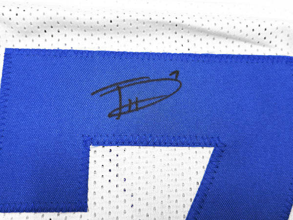 This is a White Jersey that has been hand signed by Trevon Diggs. This is a custom jersey with no name brand. The approximate size is XL. It has nice sewn in name and numbers. This item has been certified authentic by Beckett Authentication (BAS) and comes with their tamper-proof QR Code sticker that can be verified on beckett-authentication.com.