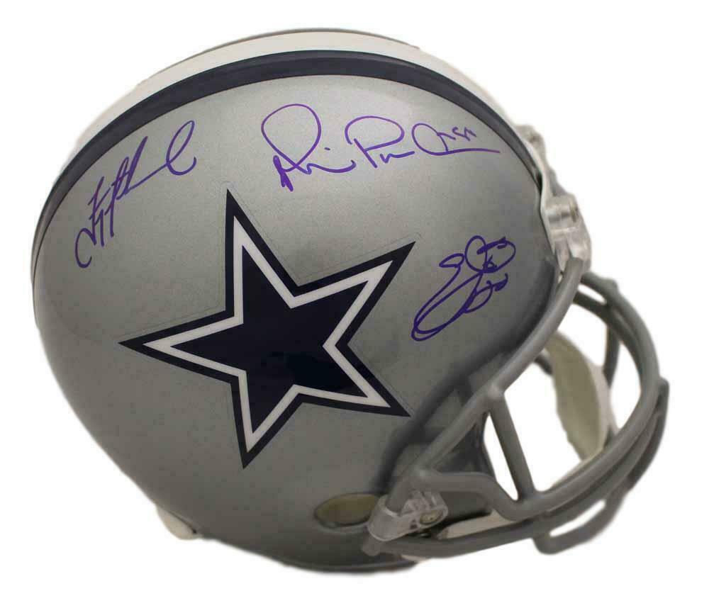 Dallas Cowboys Triplets Autographed Replica Helmet Aikman Emmitt Irvin BAS 22549 This is a Dallas Cowboys replica helmet that was personally autographed by Troy Aikman, Emmitt Smith, Michael Irvin. Thisincludes a certificate of authenticity from Beckett Authentication Services (BAS)and Denver Autographs.