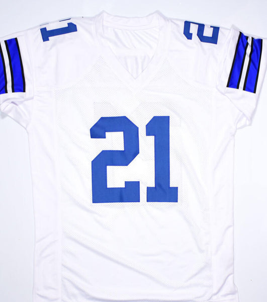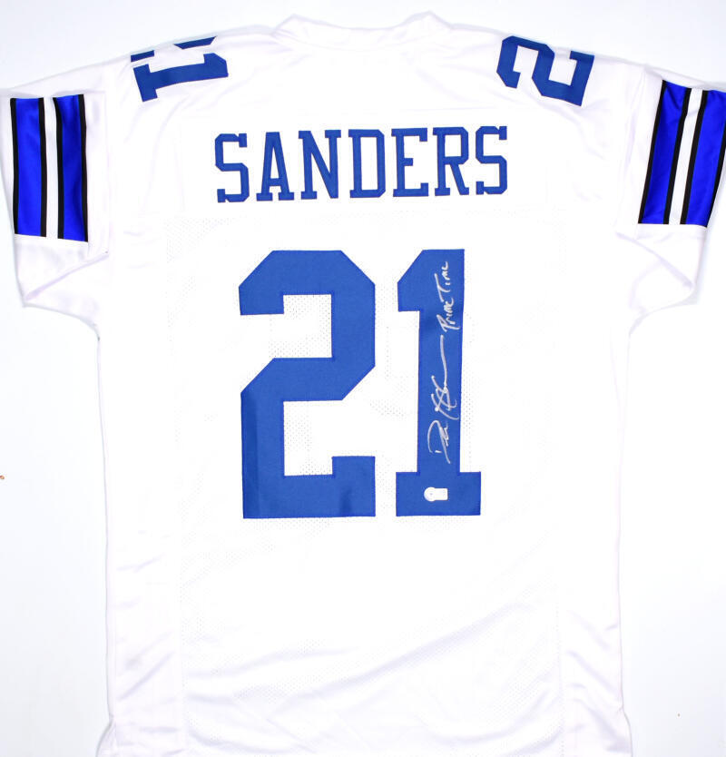 Deion Sanders Autographed White Pro Style Jersey w/Prime Time - Beckett W Hologram *Silver THIS IS NOT AN NFL JERSEY. THIS HAS NO TAGS, NO LOGOS, NO EMBLEMS. This is a hand autographed Jersey of Deion Sanders. This is Custom Made (non name brand) Authentic Style (stitched letters and numbers). Inscribed Prime Time. This item has a Beckett Witnessed Authentication, which comes with a numbered hologram and a QR code for verification. You can view this item on the Beckett Authentication website, it shows when and where the item was signed. It was signed either at a public autograph appearance or a private signing. This is a stock photo of the item. Although you may not receive this exact item, the item you receive is virtually identical and brand new in great shape. Jersey size is XL.