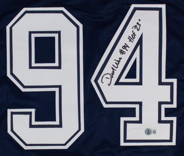 Custom on-field style jersey. Everything sewn on, size XL. Hand-signed black Sharpie pen by DeMarcus Ware ("HOF 23" inscription) of the Dallas Cowboys. This autograph is certified by Beckett Authentication Services (BAS) Witness Certification. That means that a Beckett representative was present when this item was signed. It comes with the numbered authentication scannable hologram with a QR code card that verifies the authentication on the Beckett website.