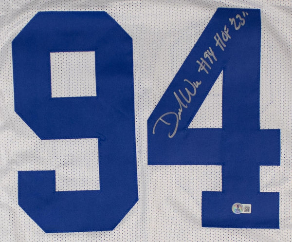 Custom on-field style jersey. Everything sewn on, size XL. Hand-signed black Sharpie pen by DeMarcus Ware ("HOF 23" inscription) of the Dallas Cowboys. This autograph is certified by Beckett Authentication Services (BAS) Witness Certification. That means that a Beckett representative was present when this item was signed. It comes with the numbered authentication scannable hologram with a QR code card that verifies the authentication on the Beckett website.