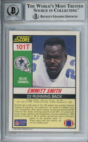 Emmitt Smith Autographed 1990 Score #101T Rookie Card Beckett Slab 37614 The number in the listing title is just an inventory sku for our records and is not the authentication number. This is the exact item that you will receive so please see pictures for condition. This is a trading card that was personally autographed by Emmitt Smith. This has been professionally slabbed by Beckett Authentication Services (BAS) and includes a certificate of authenticity from Denver Autographs.