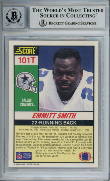 Emmitt Smith Autographed 1990 Score #101T Rookie Card HOF Beckett Slab 37608 The number in the listing title is just an inventory sku for our records and is not the authentication number. This is the exact item that you will receive so please see pictures for condition. This is a trading card that was personally autographed by Emmitt Smith. This has been professionally slabbed by Beckett Authentication Services (BAS) and includes a certificate of authenticity from Denver Autographs.